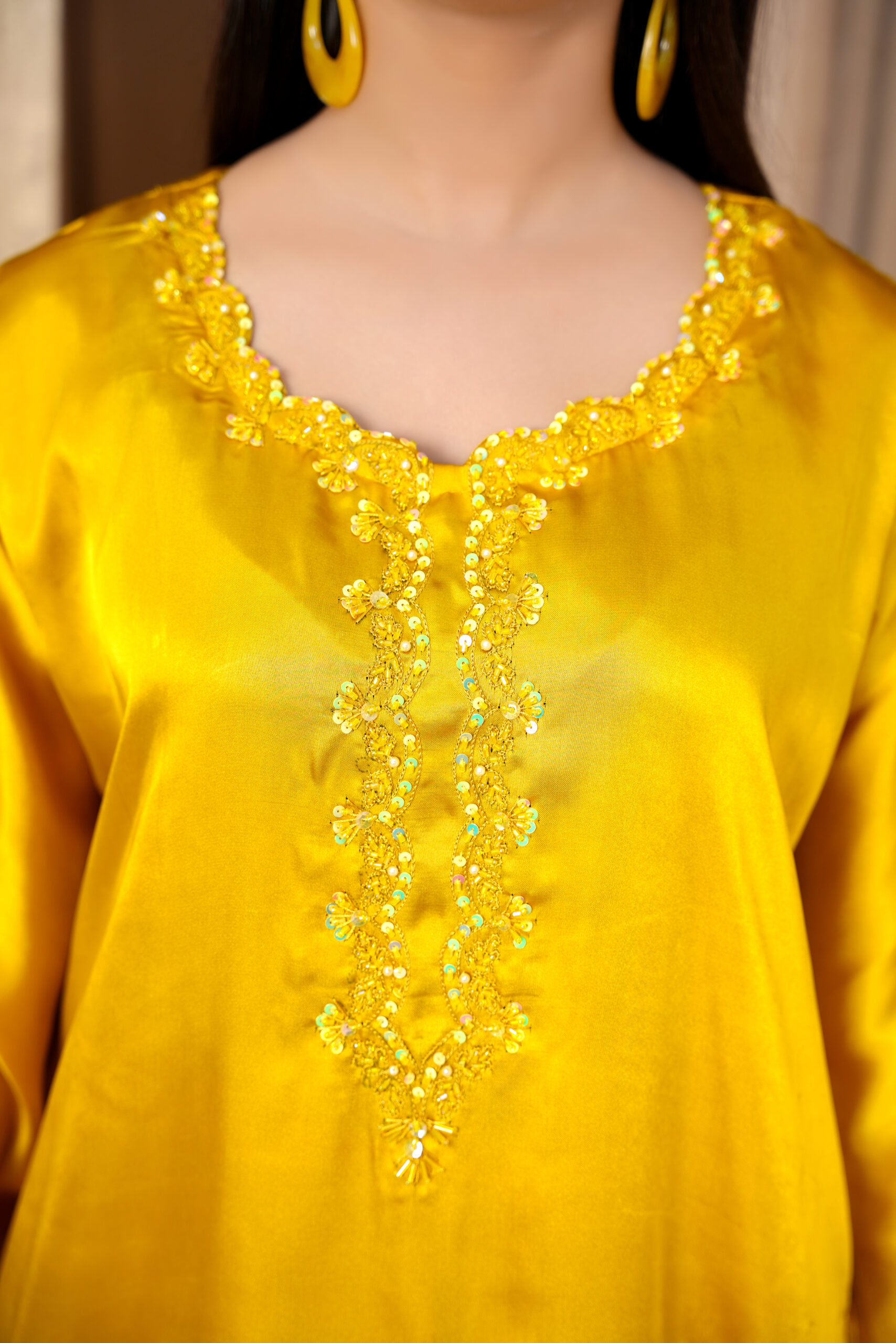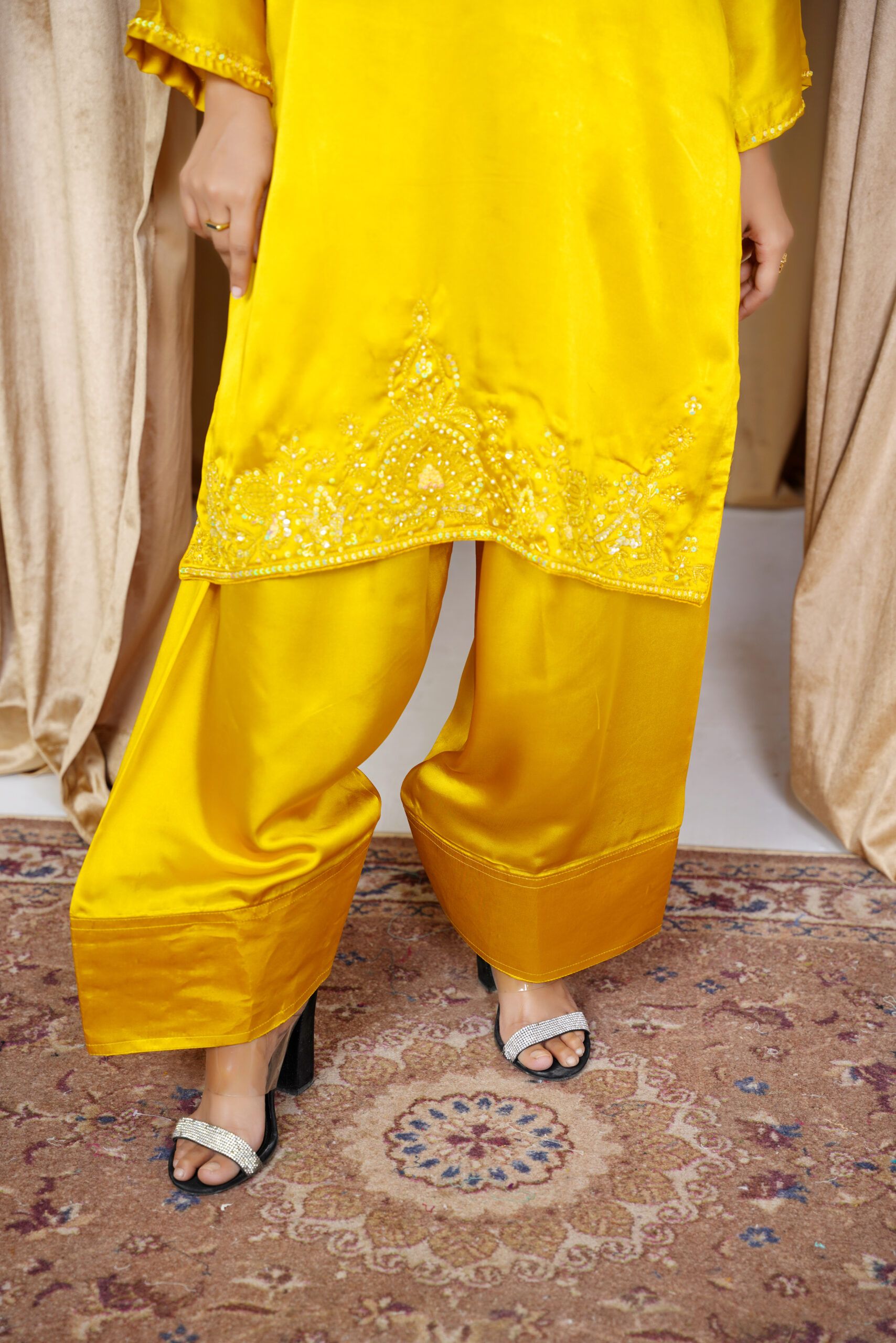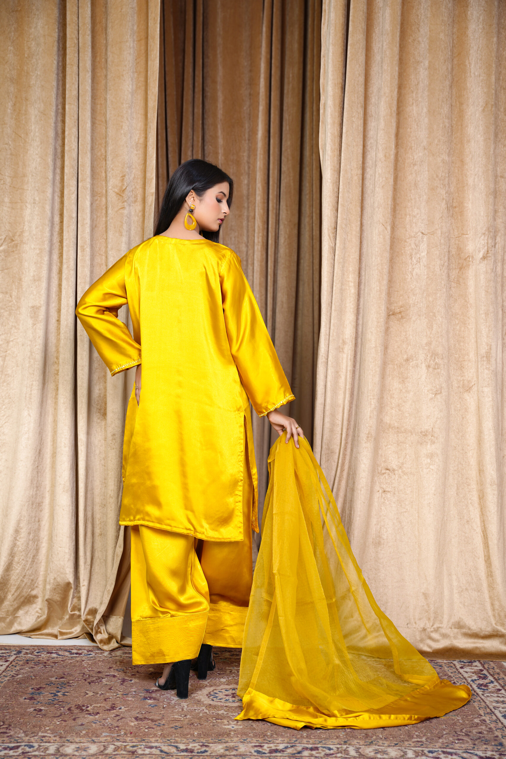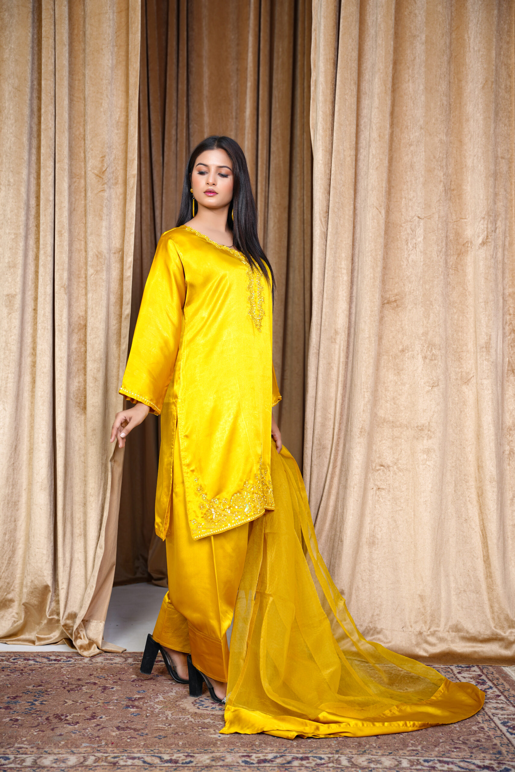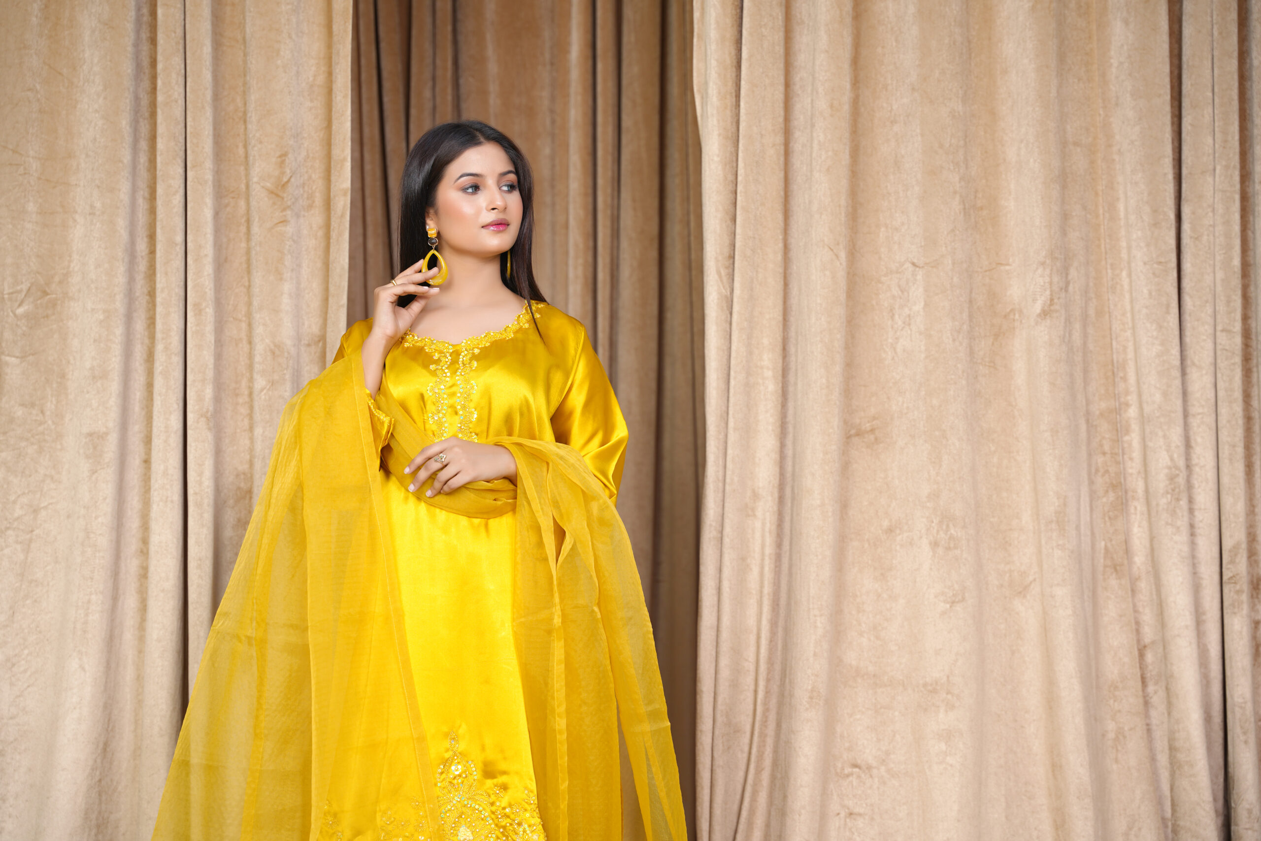 Step into timeless sophistication with our Crimson Elegance 3-piece silk suit from Sophia’s Closet. Crafted from luxurious silk fabric, this deep red ensemble blends traditional grace with modern refinement. The straight-cut kameez features delicate hand embroidery along the hem and subtle embellishments that shimmer with every move. Paired with wide-leg trousers and a flowing chiffon dupatta, this outfit is perfect for festive gatherings, weddings, or elegant evening events.
