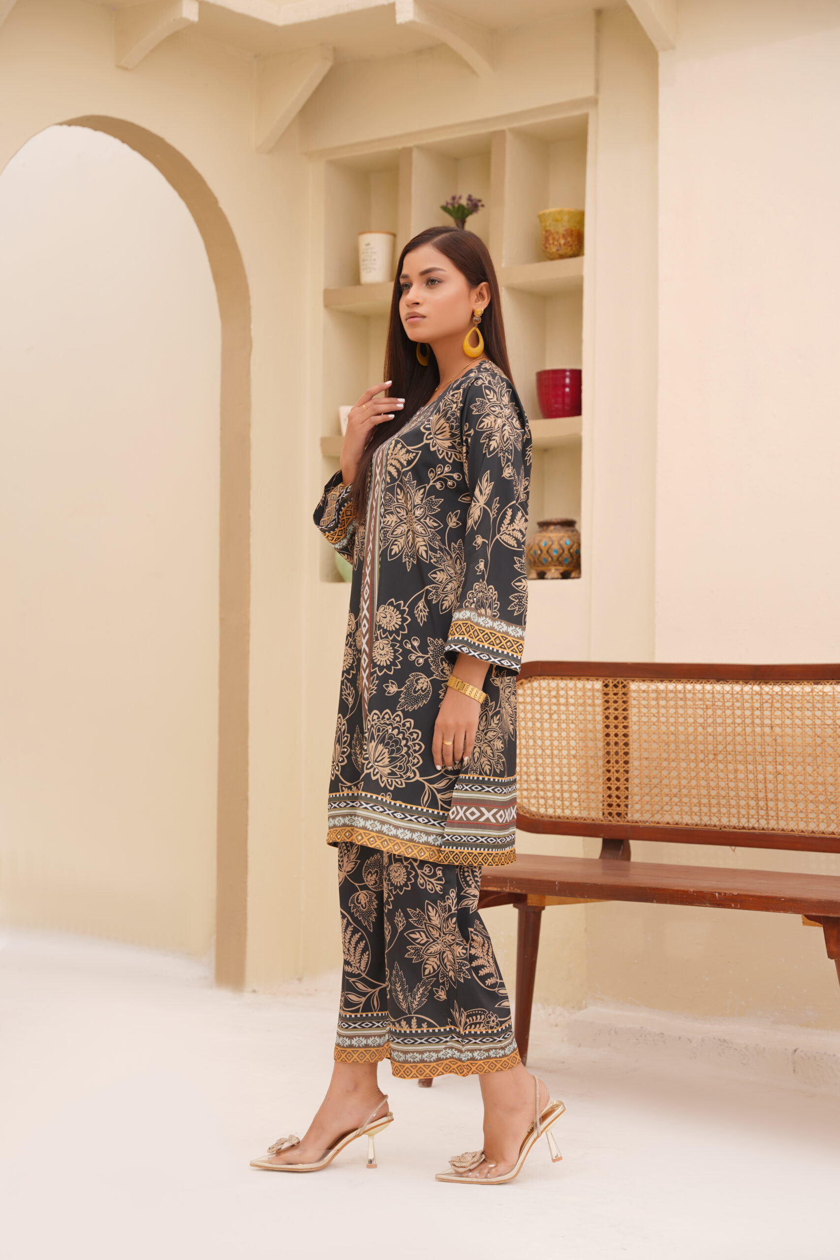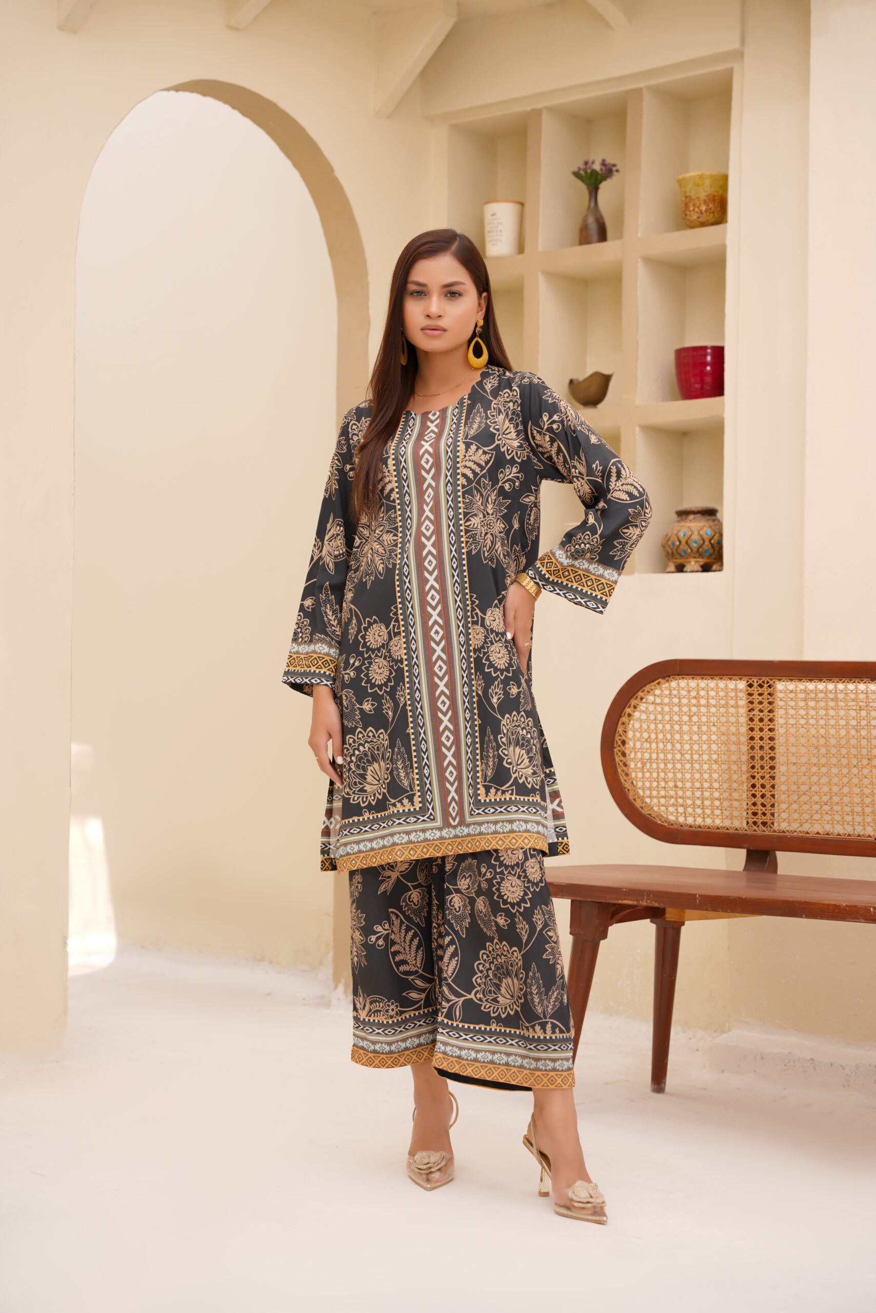 Shop the Golden Grace Printed Silk Set exclusively at Sophia’s Closet and embrace timeless style with effortless elegance.