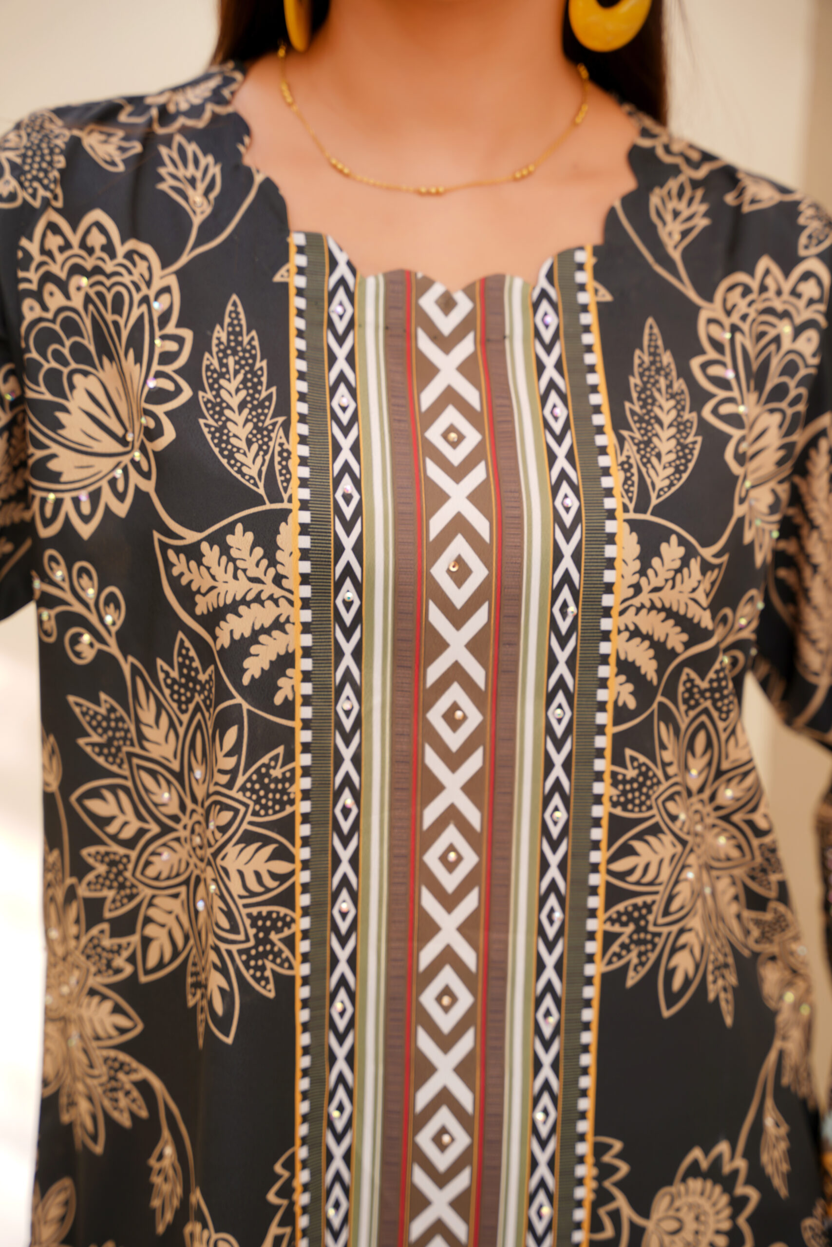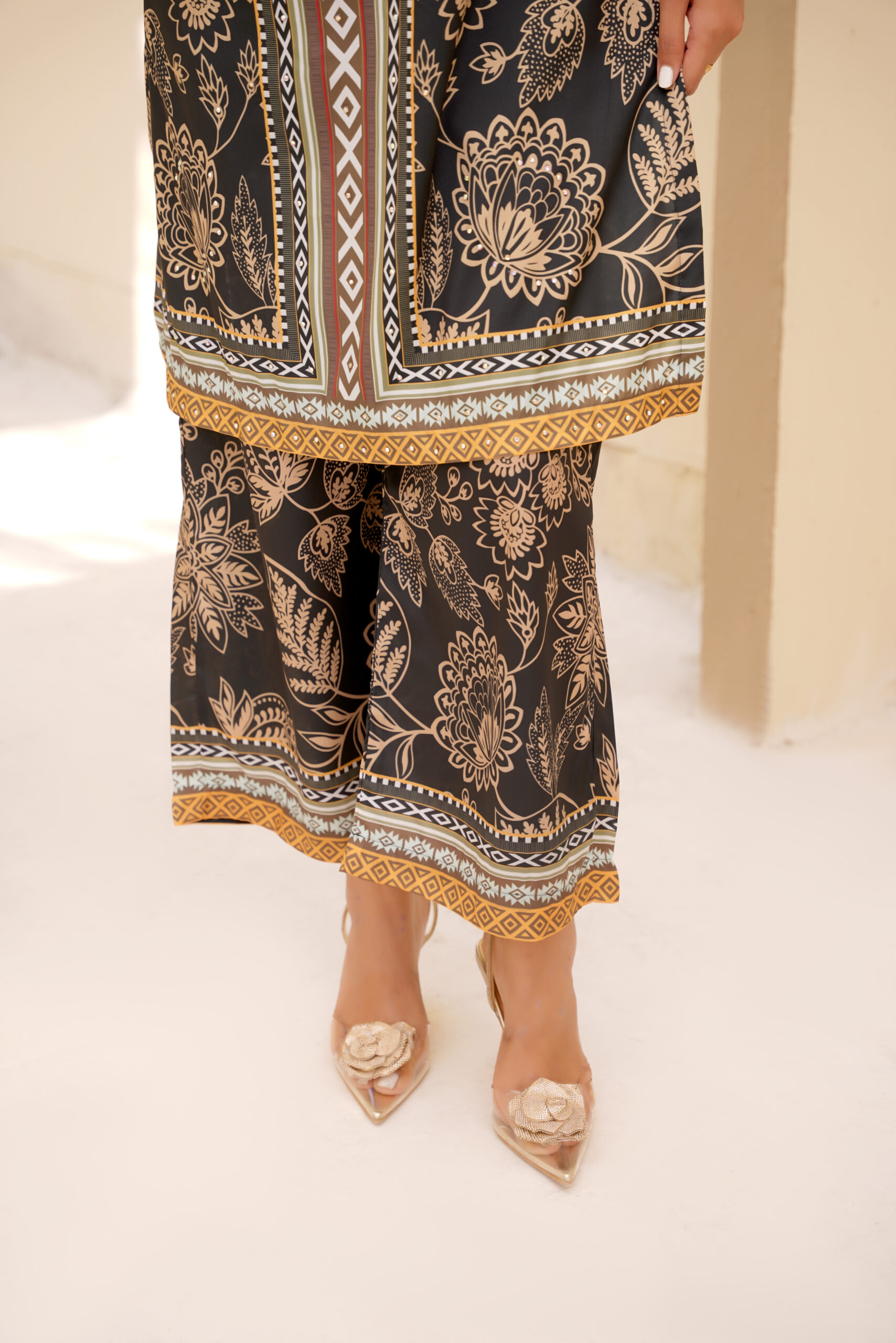 Radiate elegance in the Golden Grace Printed Silk Set by Sophia’s Closet. Crafted from luxurious silk fabric, this stunning two-piece ensemble features intricate golden floral prints on a deep base, blending traditional charm with modern sophistication. Its lightweight, breathable texture ensures all-day comfort while maintaining a polished look — perfect for festive gatherings, dinners, or elegant everyday wear.