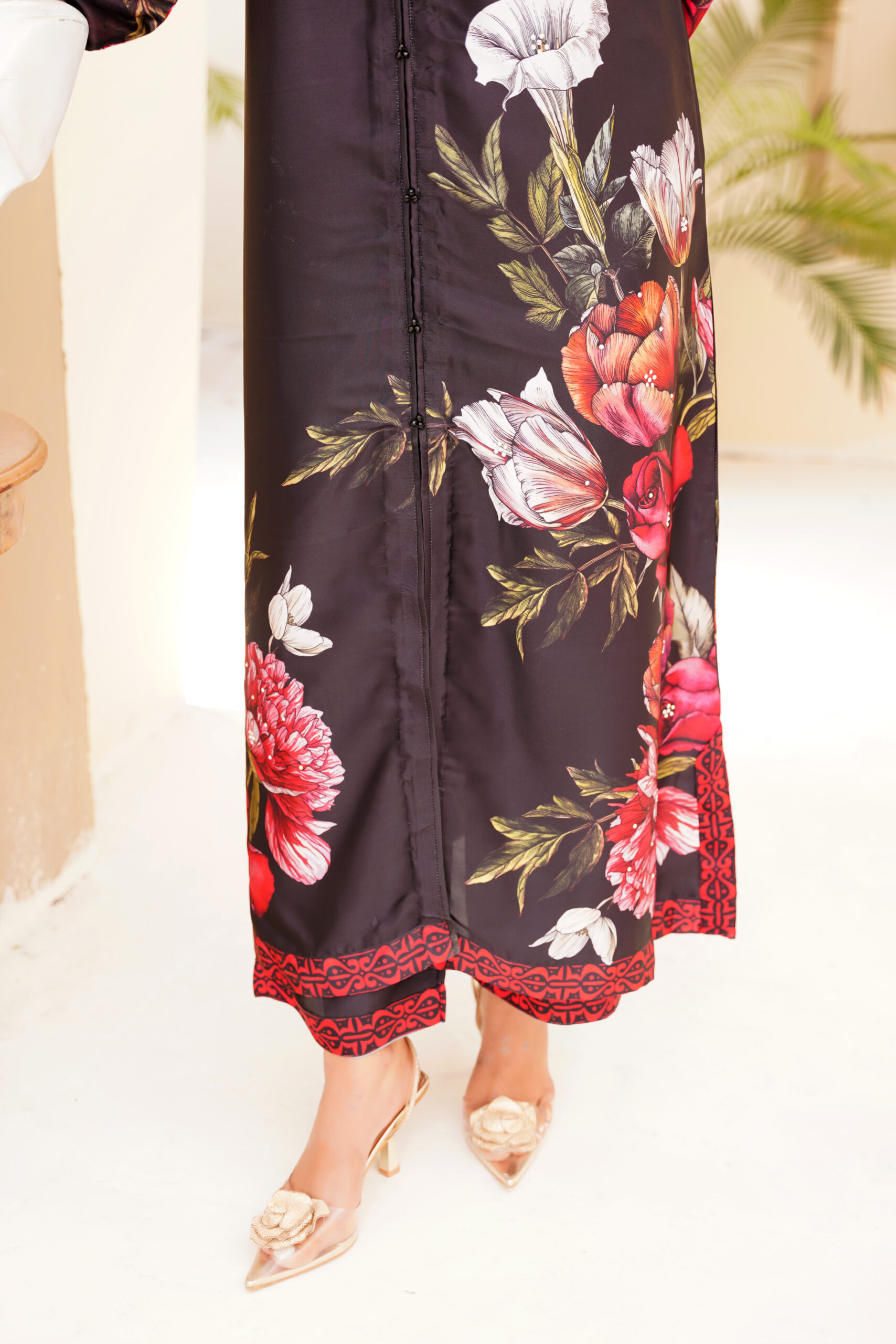 Turn heads with the Midnight Bloom Printed Long Dress from Sophia’s Closet — a masterpiece of bold elegance and effortless charm. This flowing black kaftan-style dress features striking floral prints in shades of red, green, and white, creating a stunning contrast that radiates confidence and class.