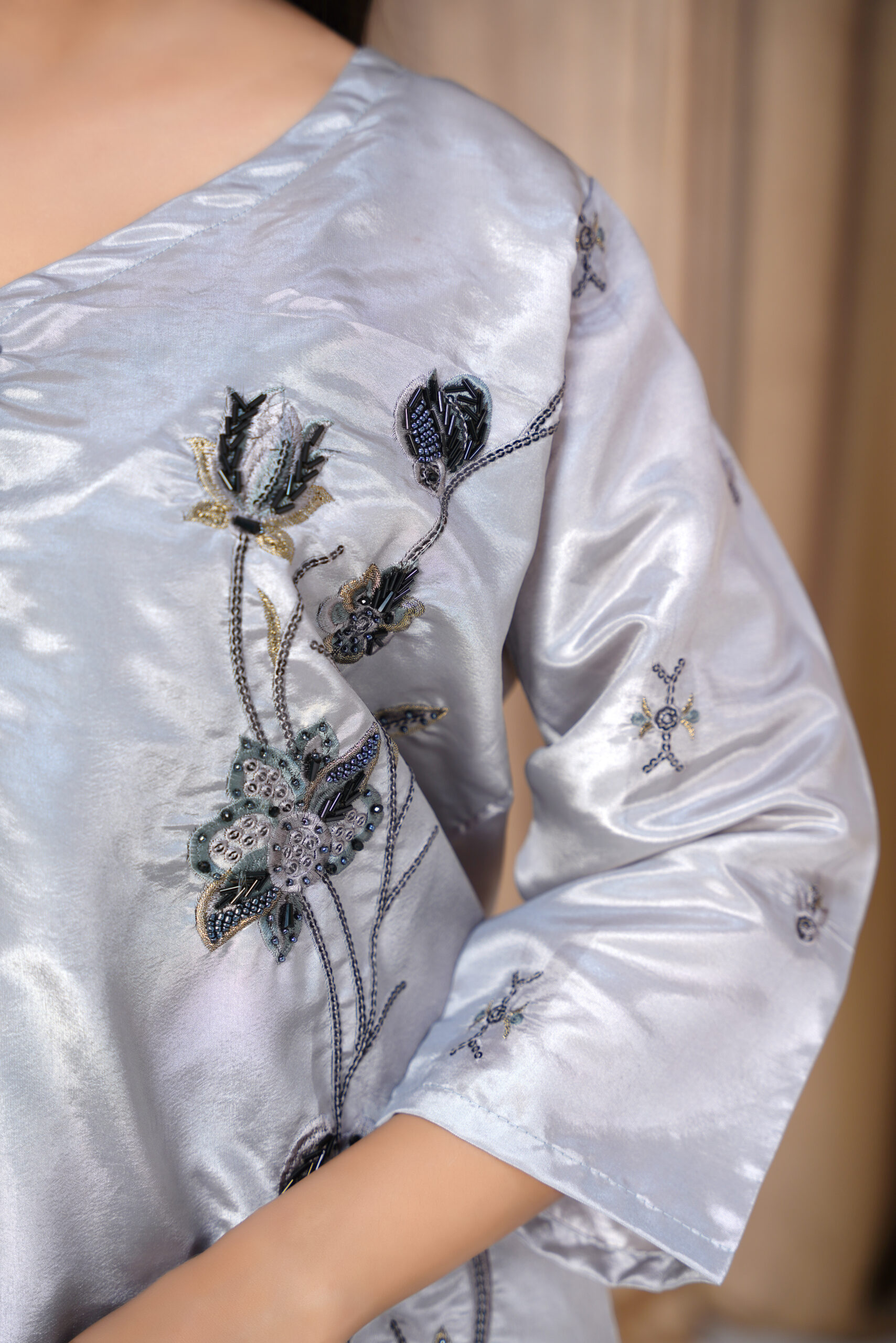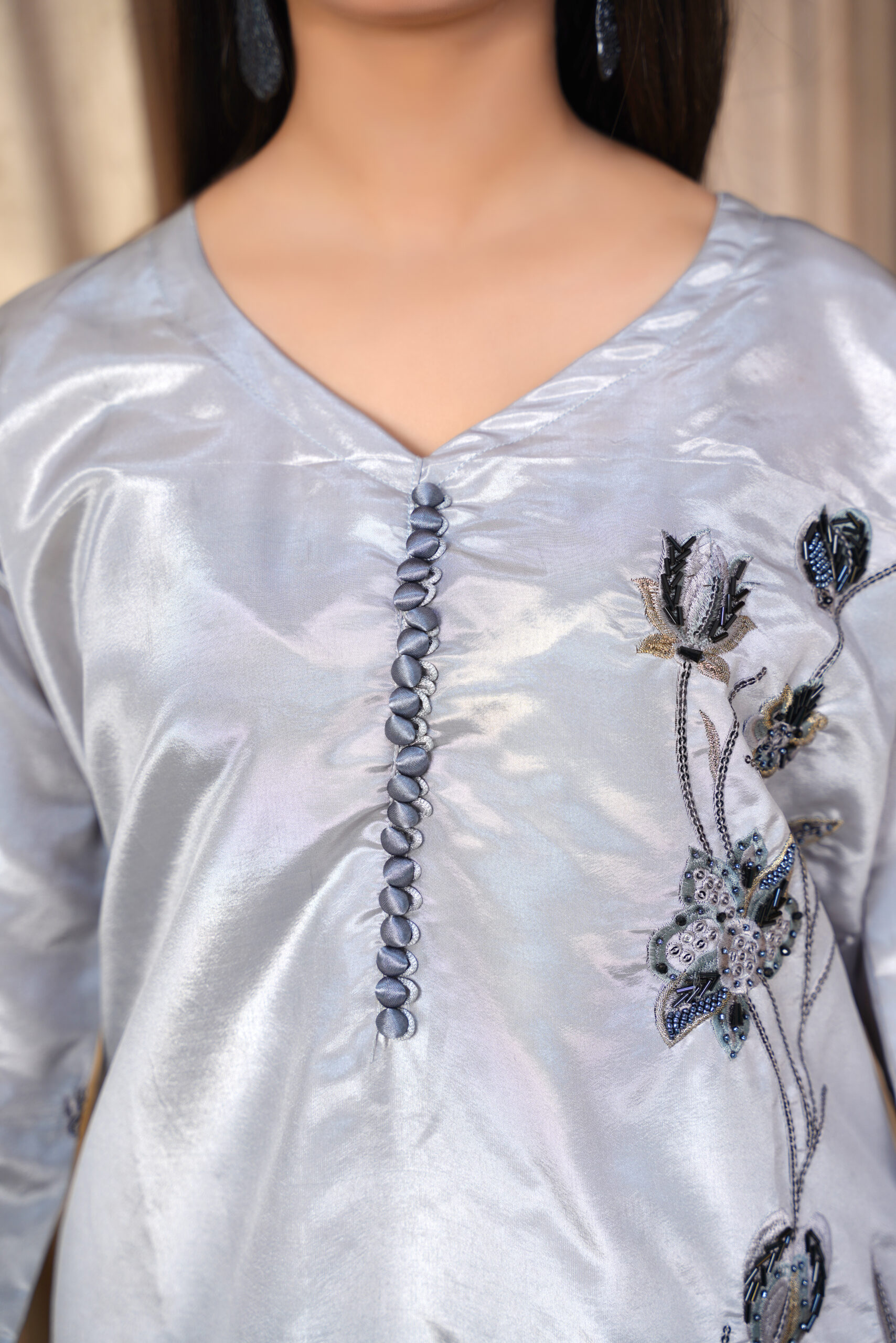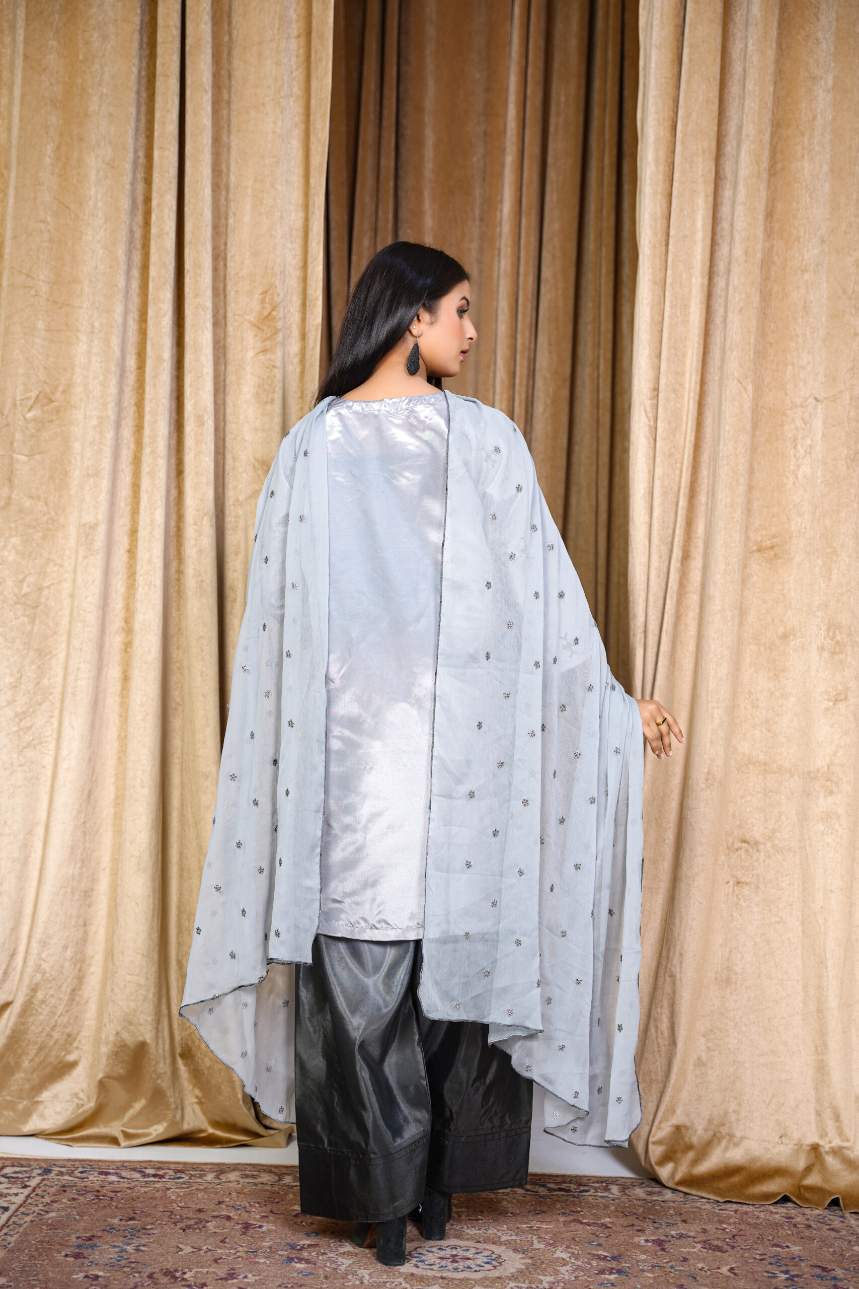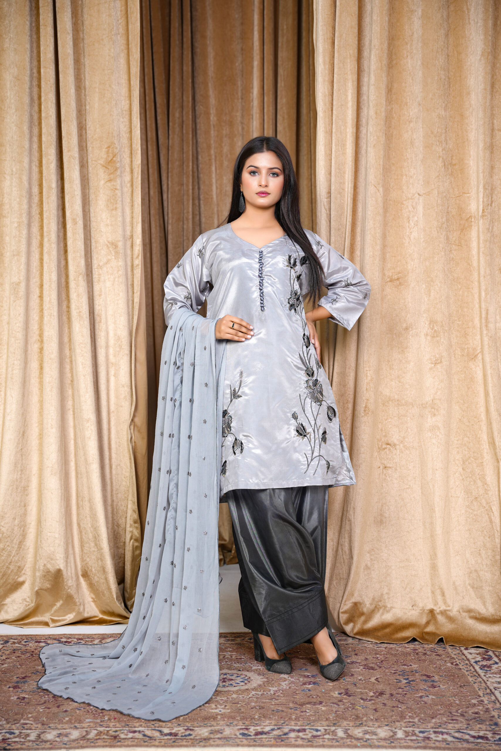 Elevate your festive and formal wardrobe with this stunning Silver Grey Embroidered Silk Suit. Crafted from luxurious silk fabric, this three-piece ensemble features delicate floral embroidery in contrasting tones, adding depth and elegance to the outfit. The straight-cut shirt is paired with sleek silk trousers and a light chiffon dupatta embellished with dainty threadwork for a graceful finish.